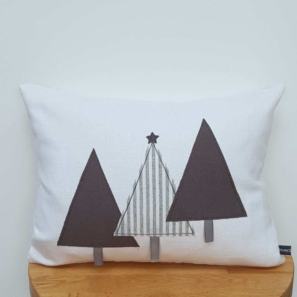 Handmade rectangular scatter cushion upholstered in white cotton with 3 grey linen trees sewn on the front. Zip fastener at the base of the cushion. Approximate dimensions: H30cms x W40cms.