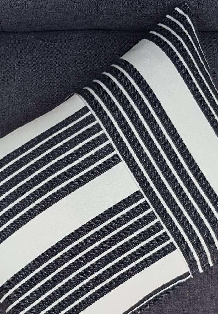 Handmade black and white striped patchwork cushion. (Vertical and horizontal blocks). Design repeated on reverse of the cushion.