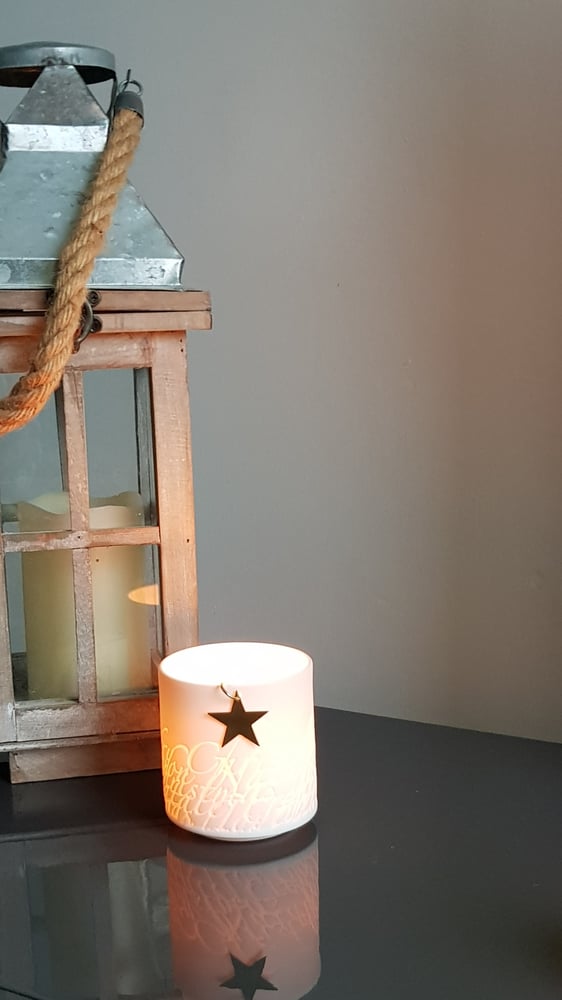 Unglazed porcelain tealight holder with brass star charm. Dimensions: Dia. 8cms x H9cms.