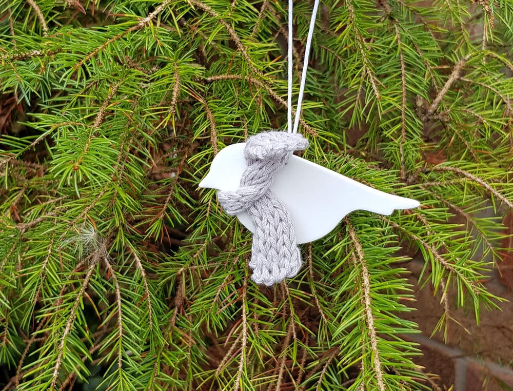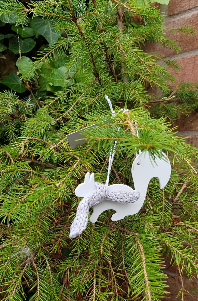 White porcelain forest animal hanging decorations with knitted scarves. Choose from: Bird 7x4.5cms, Squirrel 8.5x5cms, Bunny 7.5x6cms, Deer 10.5x9.5cms.